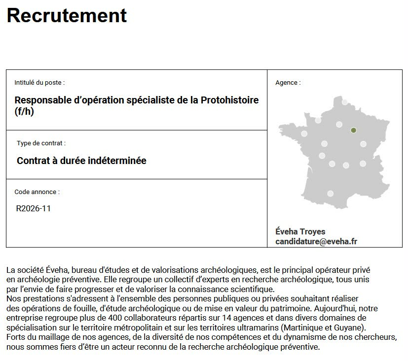 Le bureau d'études ÉVEHA recrute un Responsable d'opération spécialiste de la Protohistoire (f/h) en CDI - Troyes